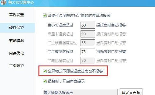 4、如果你喜欢玩全屏游戏,可勾上“全屏模式下即使温度过高也不报警”。