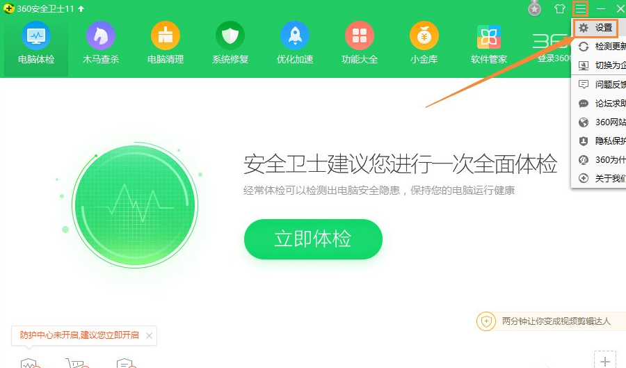 1、打开360安全卫士,点击右上角的倒三角形,在弹出的菜单中点击“设置”。