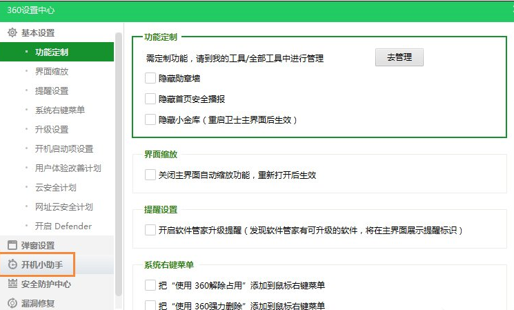 2、在设置中心找到“开机小助手”。