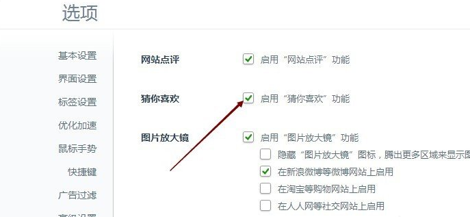4、在360浏览器实验室选项卡里,我们可以看到360浏览器默认勾选了启用“猜你喜欢功能”,如下图所示。