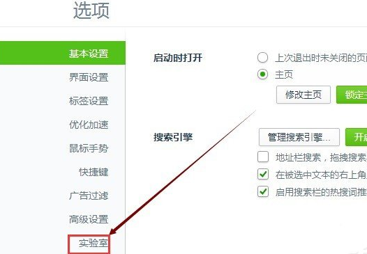 3、在360浏览器选项设置页面里,我们点击左侧导航上的“实验室”,如下图所示。