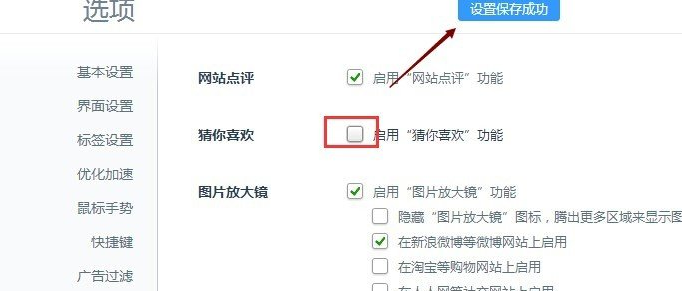 5、点击猜你喜欢后面的选择框,将√去掉。此时360浏览器会提示设置成功,这样我们就把360猜你喜欢功能关闭了。下次在打开360浏览器就不会有猜你喜欢了,如下图所示。