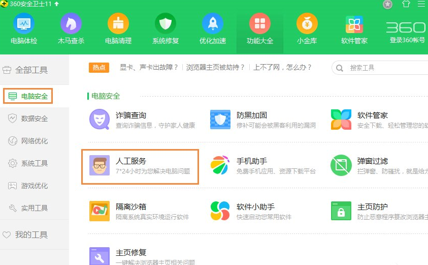 1、打开360安全卫士,找到”功能大全“中的“人工服务”功能。