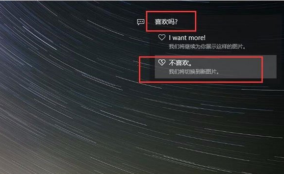 7、当我们点击“喜欢吗”的信息提示框之后,在弹出的菜单中有两种选项可以供我们选择,如果点击“不喜欢”按钮之后,系统将自动为我们切换到一张新的壁纸。