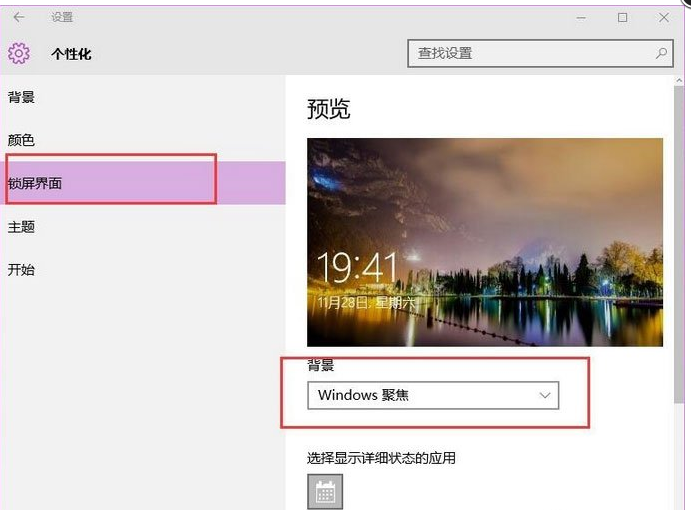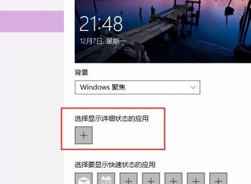 8、在Windows聚焦设置页面中,点击页面中的“选择详细状态的应用”设置项目,然后选择需要显示的应用,点击页面中的“+”按钮。