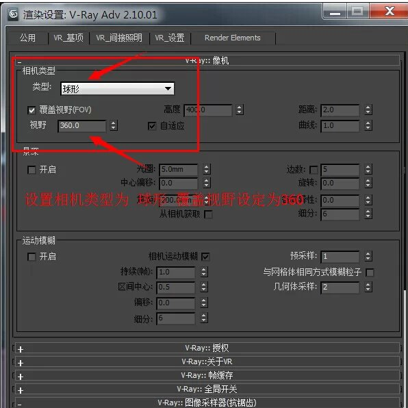 3、然后把摄影机类型选择为球形,勾选覆盖视野为360.0;