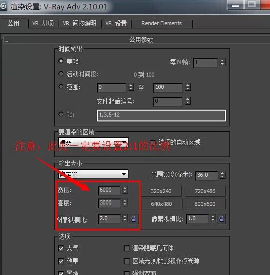 2、在渲染设置里设置宽高比为2:1(这里的宽高比例一定要是2:1,因为360全景图片宽高比必须为2:1,否则不保证制作的效果是360全景哦!要用PS中心调整为2:1比例才可继续使用。)为保证高平直,分辨率建议设置宽度至少10000像素。