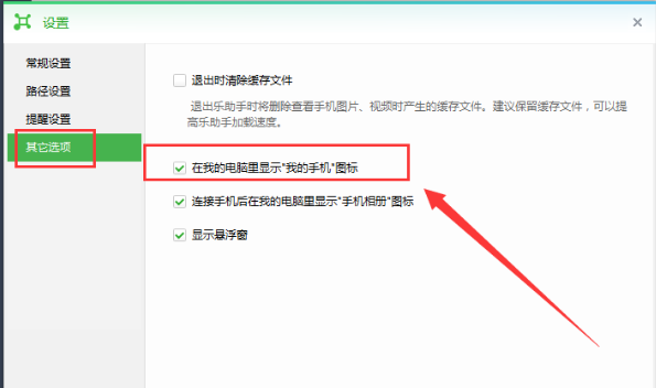 3、接着在“设置”窗口的左侧打开“其他选项”,在“其他选项”界面找到“在我的里显示‘我的手机’图标”,我们只需将它取消勾选就可以删除掉我的电脑中“我的手机”图标了。