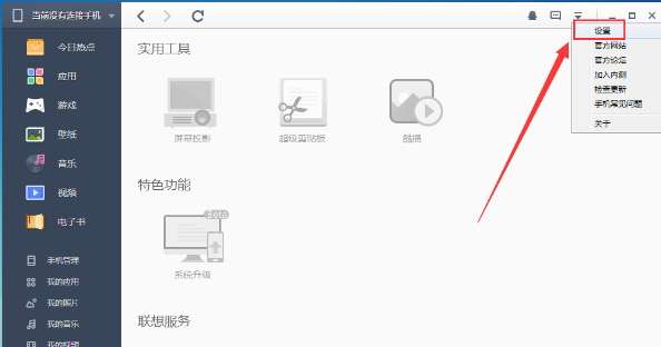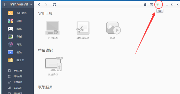 1、首先打开电脑中的乐助手软件,然后在其界面右上角找到倒三角形状的“更多”按钮,如下图所示: