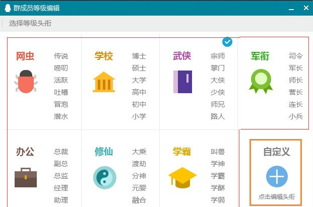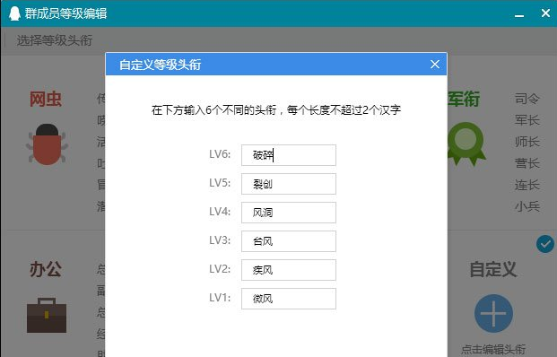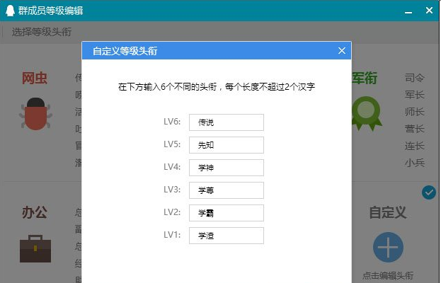 3、我们看到默认是lv1~lv6的等级,我们可以选定一个官方提供的头衔,也可以自定义编辑,点击自定义就可以编辑了。
