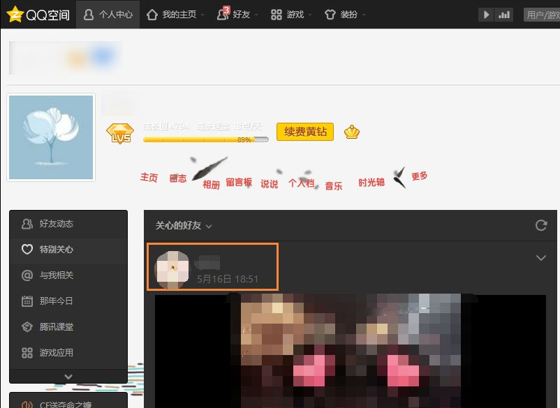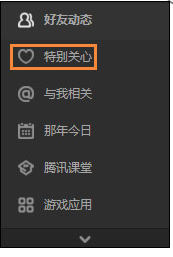 2、进入QQ空间后,我们点击左边导航的特别关心,如图。