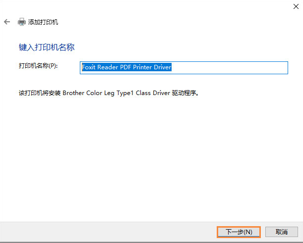 6、输入打印机名称:Foxit Reader PDF Printer Driver,再点击“下一步”。