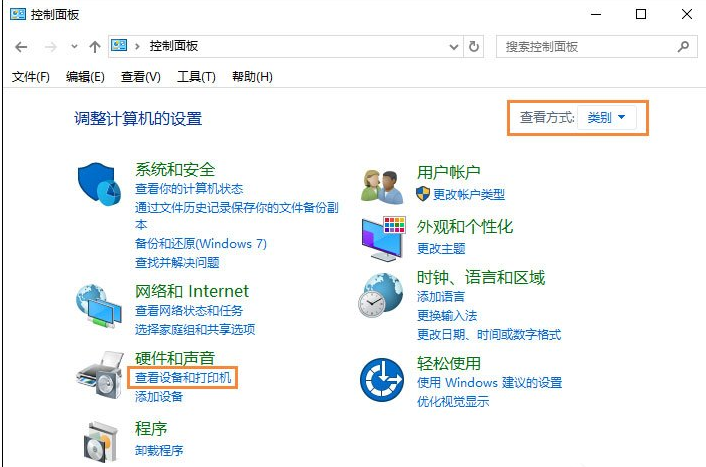 2、在控制面板窗口中选择“查看设备和打印机”选项,如图所示。
