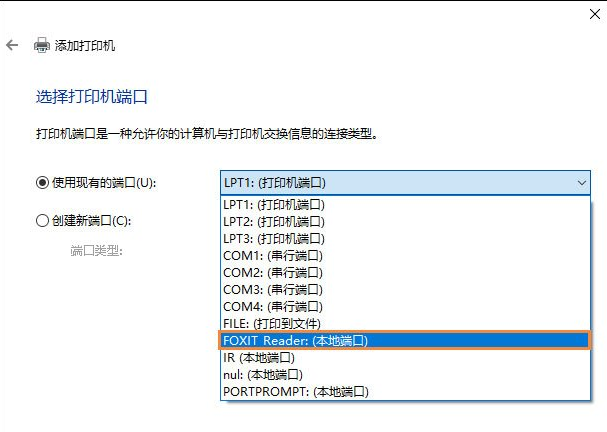 5、选中“使用现有的端口”单选框,然后在下拉列表中选择“FOXIT_Reader:(本地端口)”选项,再点击“下一步”。