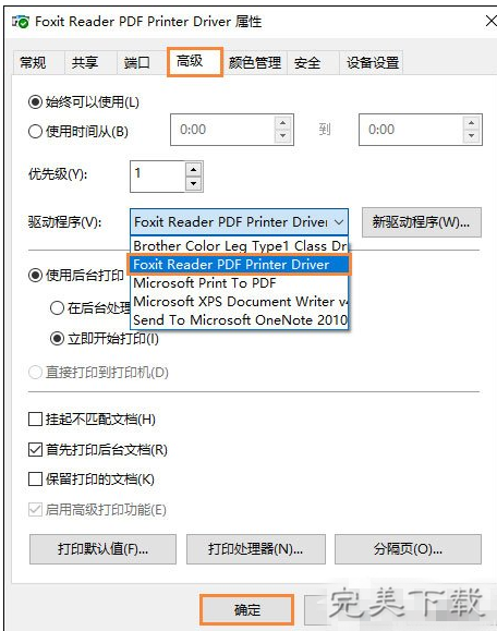 9、在属性窗口中选择“高级”选项卡,然后在驱动程序下拉列表中选择“Foxit Reader PDF Printer Driver”,再点击“确定”即可。