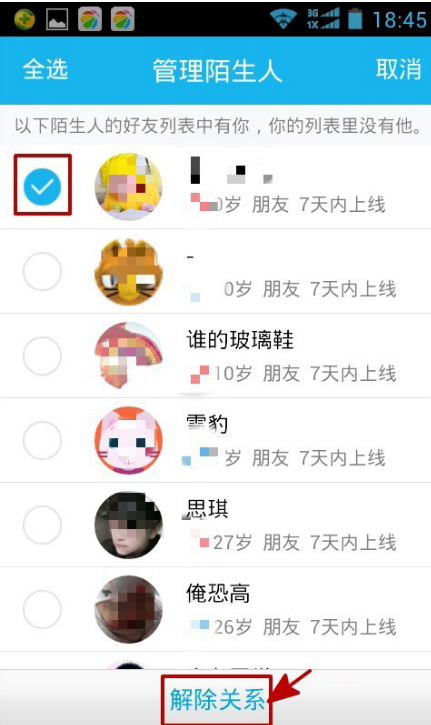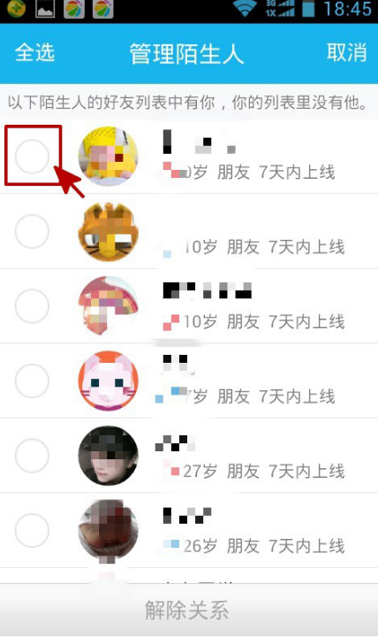 6、选择要解除关系的陌生人,点击头像前方“圆圈”;