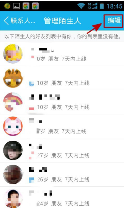 5、此处出现的都为他列表里有你,我列表里没他的,页面右上角点击“编辑”;