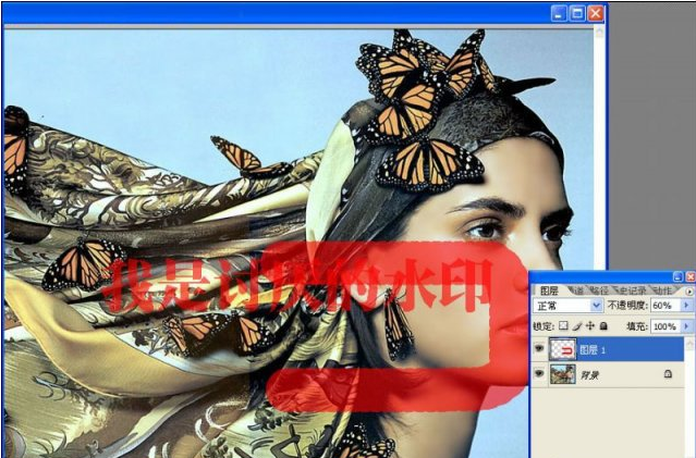 2、看到了吗?60%,和原始水印一模一样,你可以放大你的水印和原水印重合的部分,用吸管来判断。FF0000,60%。OK,确定了这两点,我们还原有望了。回到原始的水印图片,我们选出水印的选区,新建一层并填充红色。(记得保存选区待用)