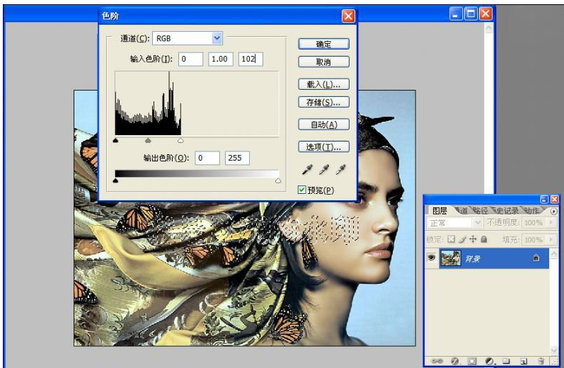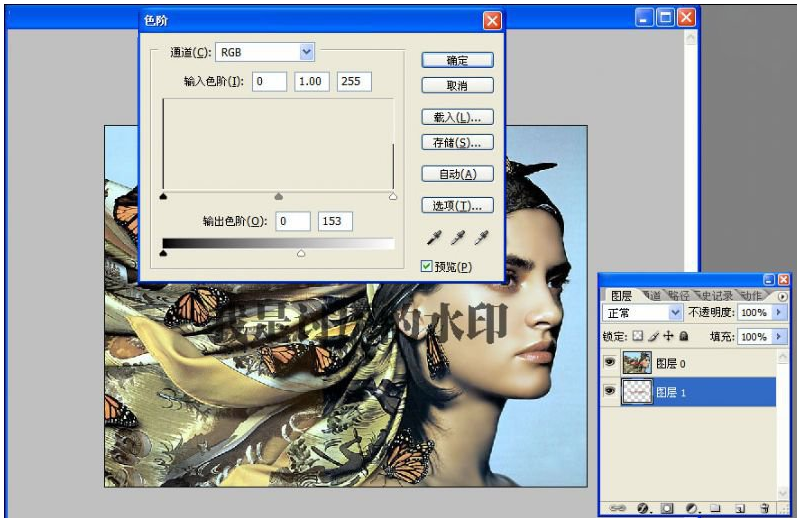 5、拼合图层,载入水印选区,调整输出色阶为255×(1-60%)=102。