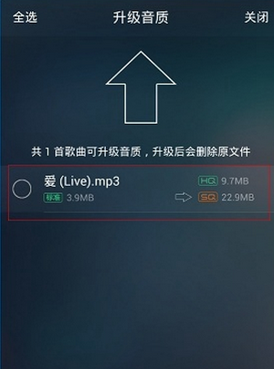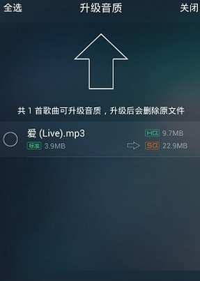2、此时手机QQ音乐会扫描你手机里音质较差的音乐,扫描完成后,勾选要升级的音乐,点击【升级音质】就可以了。(如下图)