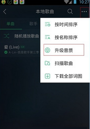 1、打开手机QQ音乐,选择【本地歌曲】,点击右上角【...】,在弹出菜单中选择【升级音质】;(如下图)