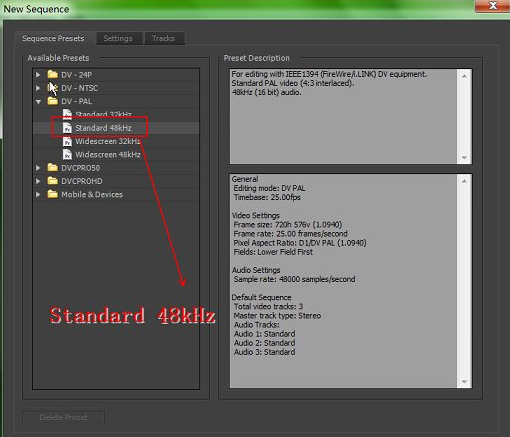 2、在这里我们选择的是DV_PAL选项下的Standard 48kHz,选择的是视频编码模式与音频频率等,选上之后点击OK进入下一步。