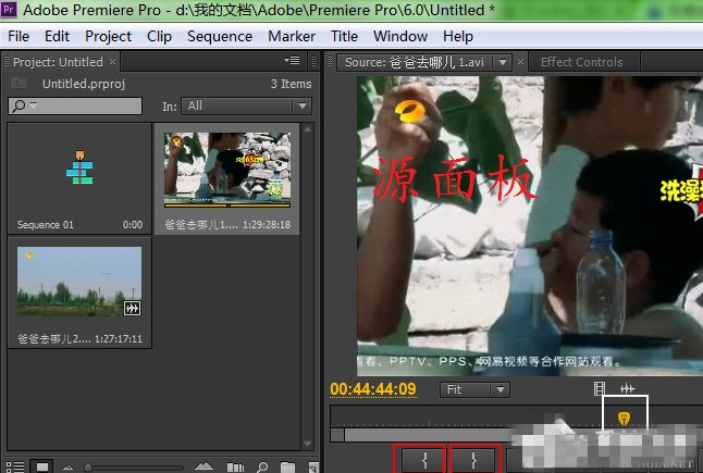 4、双击素材面板中《爸爸去哪儿1》,右边窗口“源面板”便会显示预览,在源面板中我们可以进行简单的视频剪辑和处理。现在我们先来看一下“源面板”上的按钮吧,圈住的分别是入点和出点;而白色方框圈住的是滑块,代表的是视频进度。