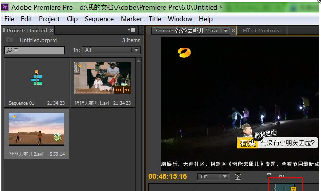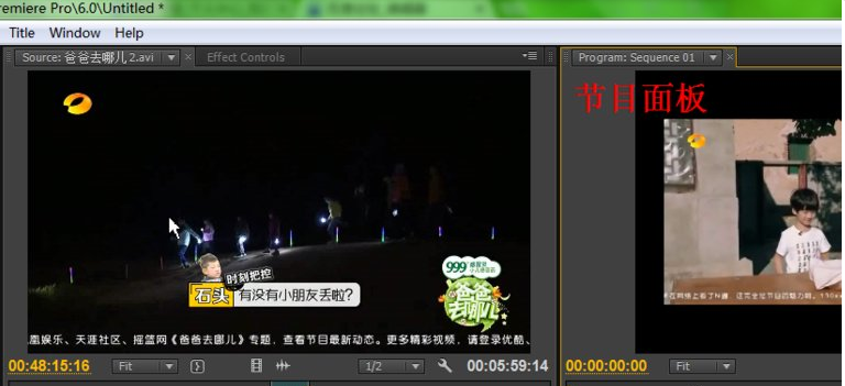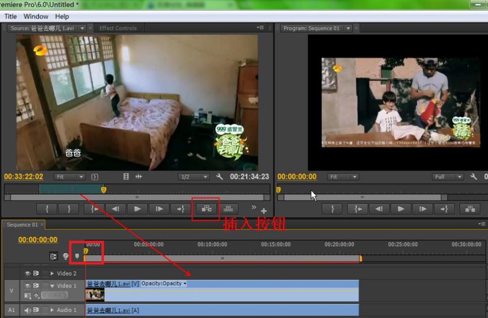 当然,你也可以进行微调,图中白色方框圈住的分别是“滑块逐帧向前移动”和“滑块逐帧向后移动”,你可以多次点击来进行仔细调整。调整好之后跟刚才的操作一样,在时间线上把滑块移到之前剪辑好的视频后面,然后点击源面板上的“插入”按钮。这样我们就成功地把《爸爸去哪儿2》的片段拼接到《爸爸去哪儿1》的片段后面了,是不是很简单?