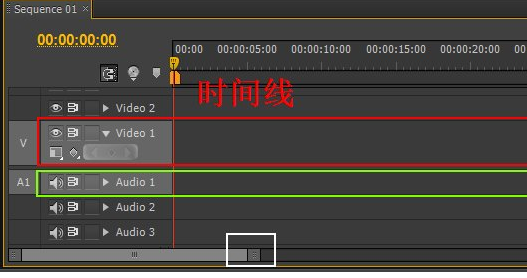 6、这时候,我们来看一下在源面板下方的时间线。Vidoe1表示视频轨道一,Audio1表示音频轨道1。我们只要把音视频分别拖到这里即可。另外需要注意的是:图中白色方框圈住的地方,按住拖动可以放大或缩小时间线,当剪辑的视频时间很长时,可以拖动来缩小轨道视图。
