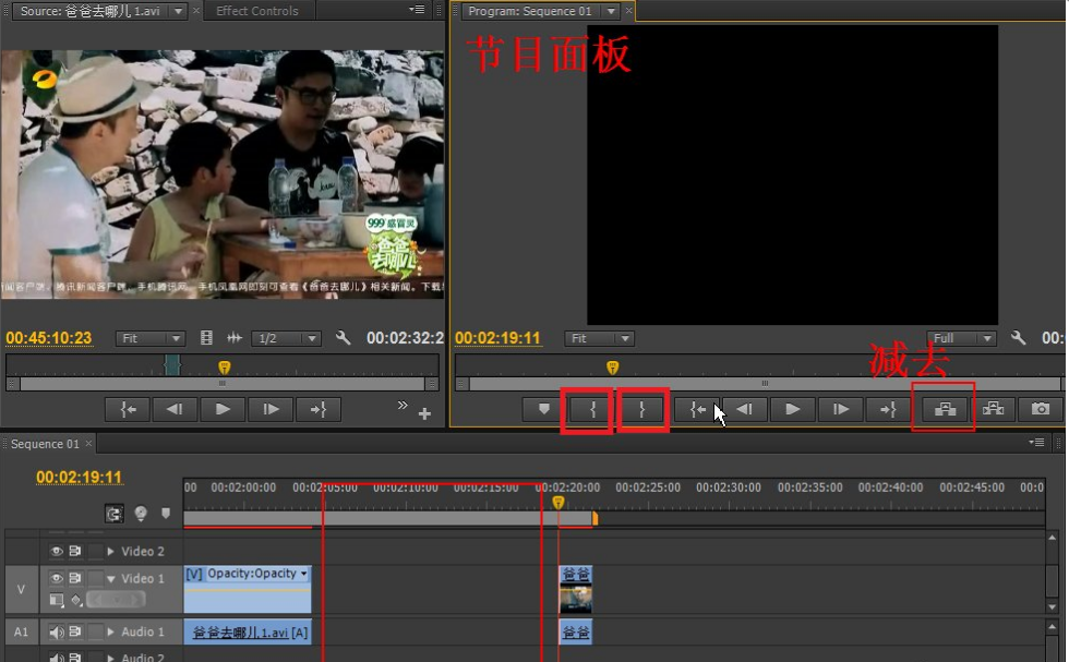 8、节目面板跟源面板差不多,同样具有入点和出点,那么这里的出点和入点分别有什么作用呢?在节目面板预览的时候,当你想去掉一段片段时,那就在这段片段的开始和结束处分别设置出入点吧。设置好了之后,点击图中“减去”按钮即可去掉片段。这时按住时间线上视频,可移动视频的具体位置,现在赶快把中间的空位挤掉吧。