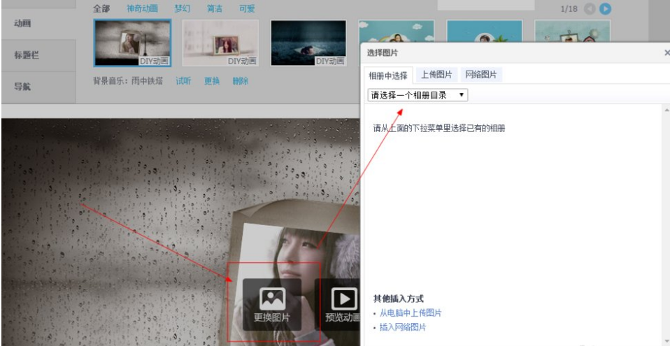 7、如图所示,我们以这个动画模版为例,点击箭头所指的更换图片这里,我们会看到弹出一个选择图片的对话框,我们选择一张自己喜欢的图片。