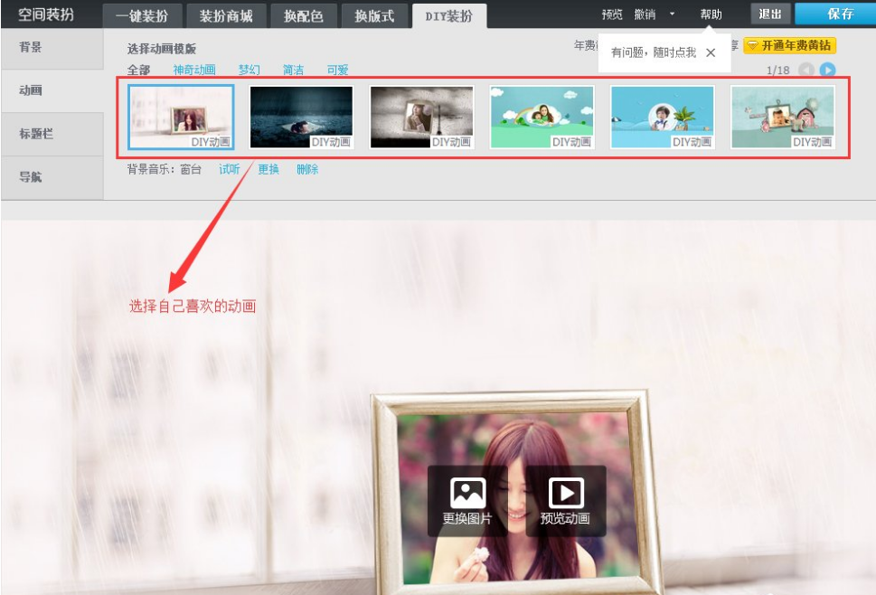 10、如果喜欢这个QQ空间开场动画,我们可以点击箭头所指的“保存”按钮,就可以将我们DIY的动画进行保存了。