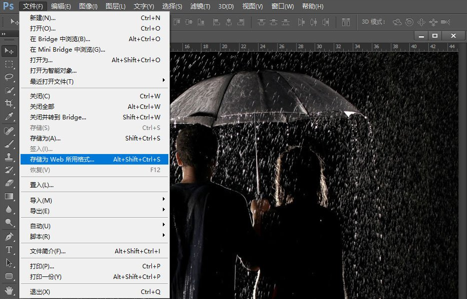 3、点击工具栏上的文件按钮,在弹出的菜单中,点击“存储为WEB所用格式“按钮;