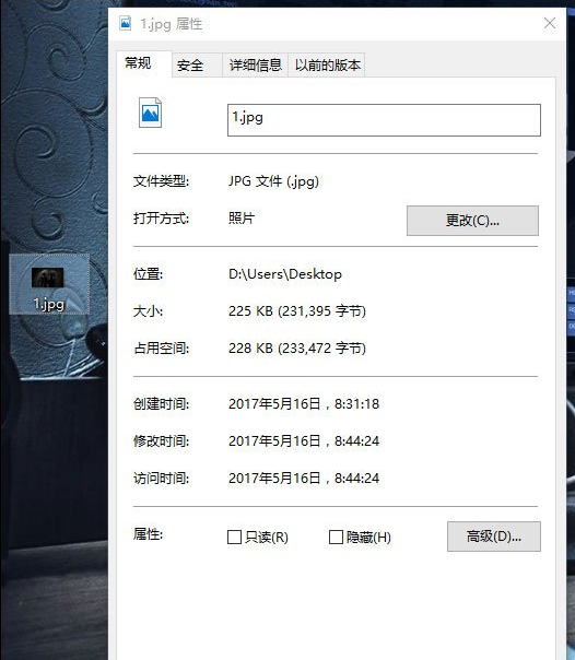 1、我们首先看看要修改的图片的大小和像素值,大小225KB,像素值为1280×800;
