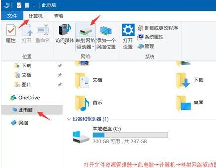 13、打开文件资源管理器→此电脑→计算机→映射网络驱动器;