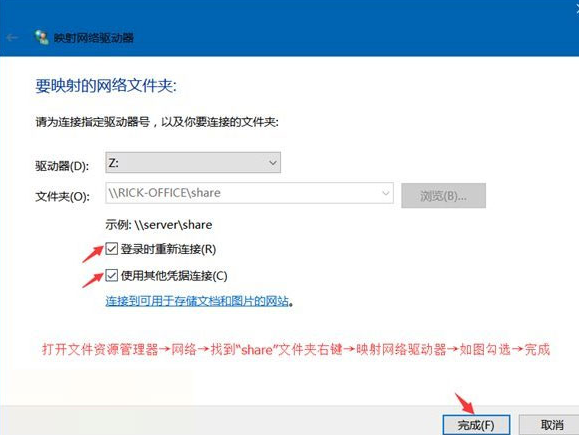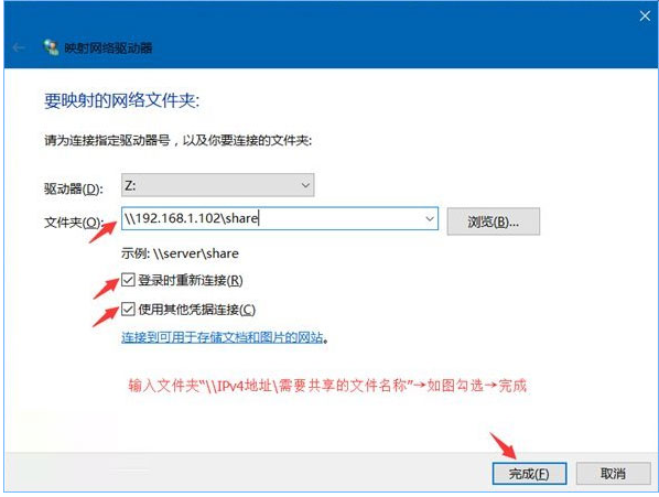 14、输入文件夹\\\\IPv4地址\\需要共享的文件夹名称→如图勾选→完成;