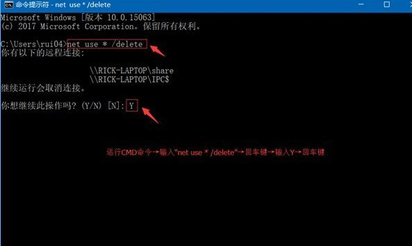 1、运行CMD命令→输入“net use * /delete”→回车键→输入Y→回车键;(此步骤只需首次操作)