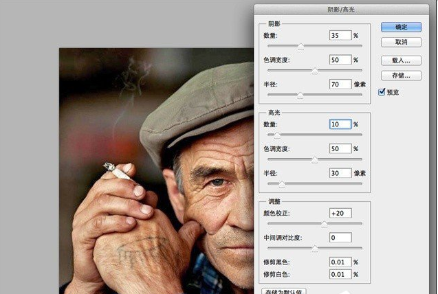 接下来我们要做的是,打开菜单中的图像>调整>阴影/高光,将阴影的半径数值调整到70,将高光的数量调整为10。需要注意的是,在阴影/高光中要勾选显示更多选项,才能进行数值的调整。