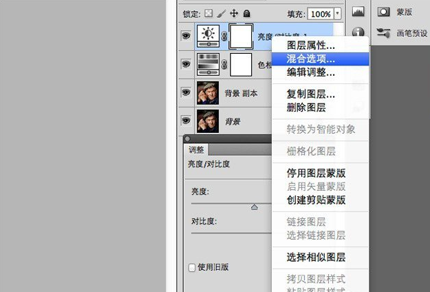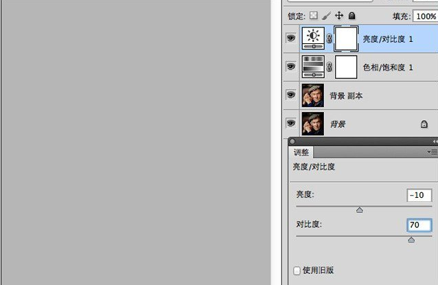使用同样的方法添加一个亮度/对比度的调整层,并降低图像的亮度和提升对比度,数值是亮度-10,对比度为70。