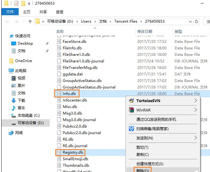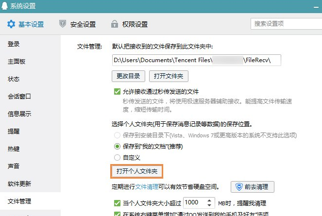 2、登录QQ,进入系统设置 → 基本设置 → 文件管理 → 打开个人文件夹,退出QQ后删除Info.db、Registry.db这2个文件后重新登录尝试使用;