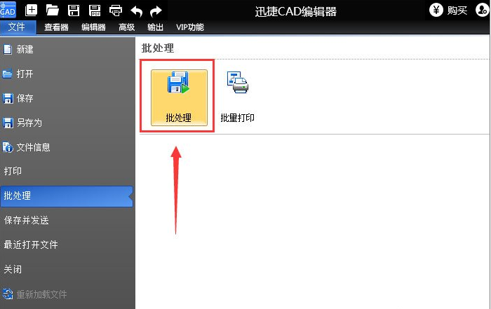 1、运行CAD编辑器,软件打开以后,点击界面里的“文件”选项,再点击“批处理”选项,打开批处理界面。