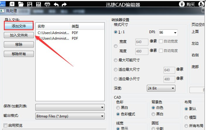 2、批处理界面打开后,点击左侧的“添加文件”选项,将需要进行转换的PDF文件,添加到软件当中,在这里是可以添加多个PDF文档的,如果想要将多个PDF文档进行转换,可以选择全部PDF文档进行添加。