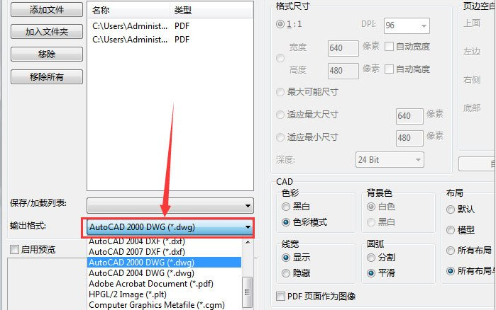 3、接下来在“输出格式”下拉列表中选择对应版本的DWG格式文件。