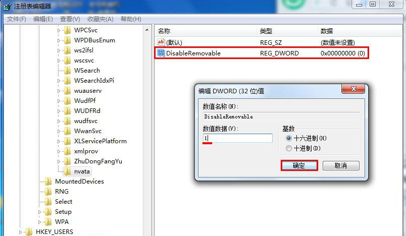 4、双击DisableRemovable键值,然后在编辑窗口中将数值数据修改为“1”,点击“确定”保存即可,如下图所示: