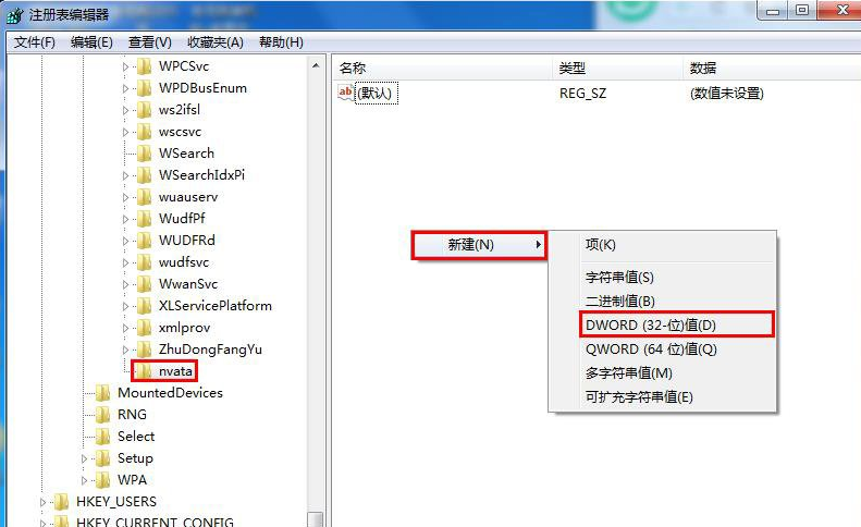 3、接着右键点击nvata文件夹,新建一个DWORD(32-位)值,将其命名为“DisableRemovable”,如下图所示: