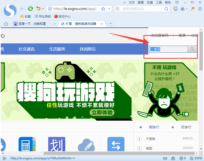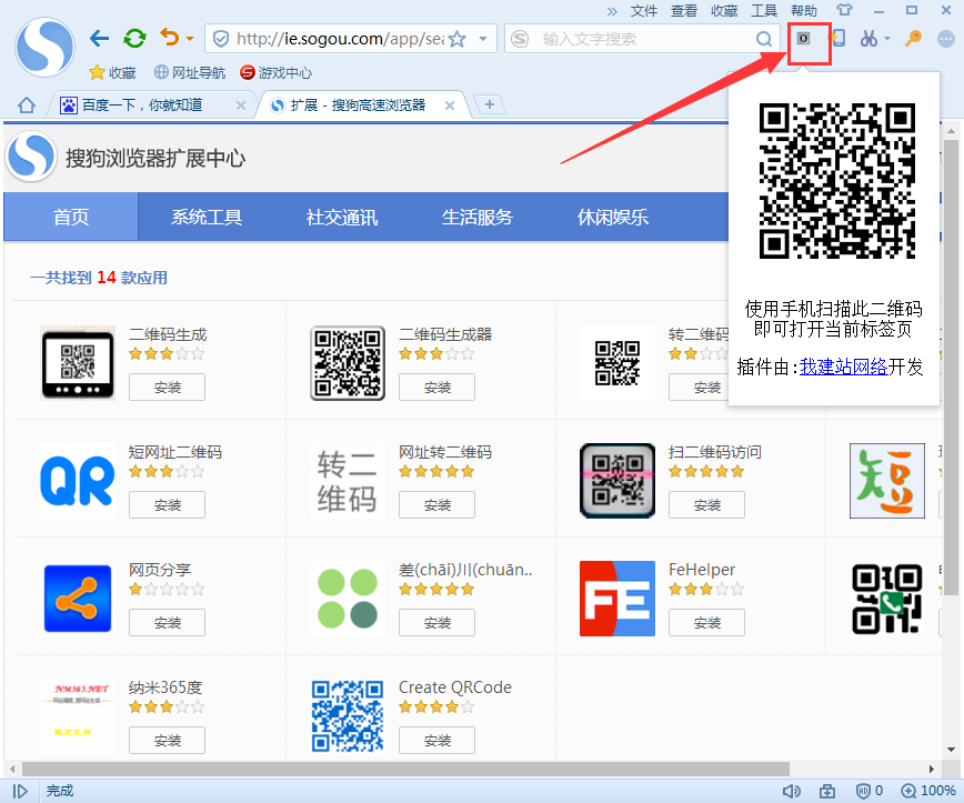 4、安装完毕后在搜狗界面的右上方会多出来一个图标,点击它就可以看到我们当前网页的二维码了,用手机扫描的话就会打开和电脑一样的网址。