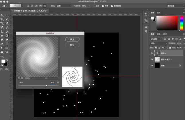 6、选择“滤镜-扭曲-旋转扭曲”,在弹框中,修改角度400度,点击“确定”