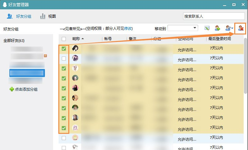 2、在左边找到需要删除的好友的分组,并在右方点选QQ好友头像,在点击右上角的“删除QQ好友”图标;