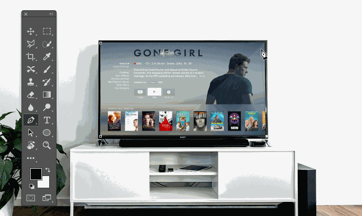 “剪贴蒙版”,工作原理就是上层填充到下层里,是个稍微有点曲折的抠图方法,好处是它可以被应用到多个图层上、多次使用,而且不破坏原图,一键做多图也是蛮好的,当然可能被用到的不多,但是在制作Mockup的时候,就能更多感受一些这个方法的便利了。比如,我们以下图为例,要抠出电视的屏幕部分。我们先用钢笔工具,绘制出它的轮廓: