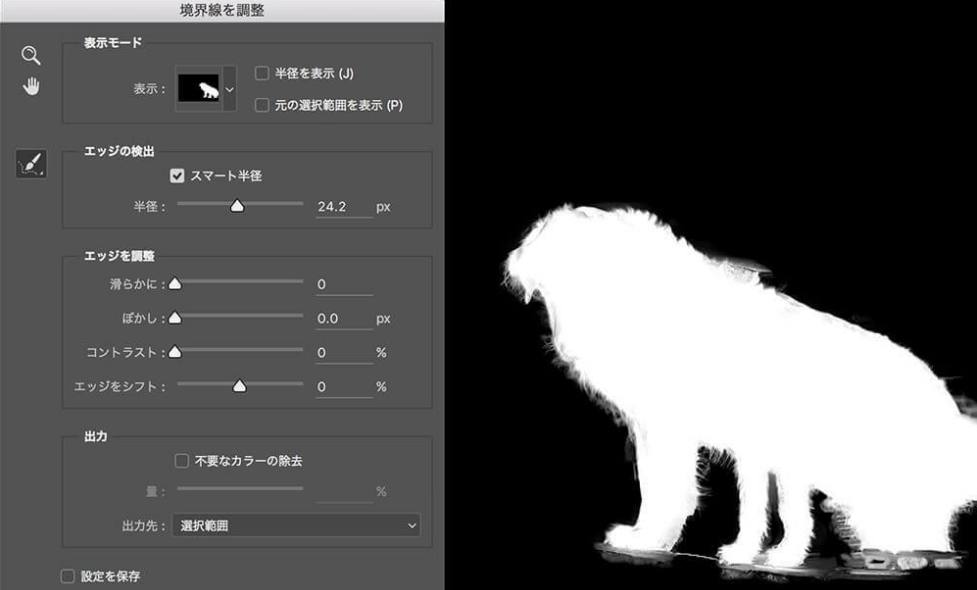 在对边缘轮廓处理的时候,还可以选择面板左侧的“调整半径工具”,直接在边缘上涂抹即可去除杂色,让边缘更清晰,如下图所示: